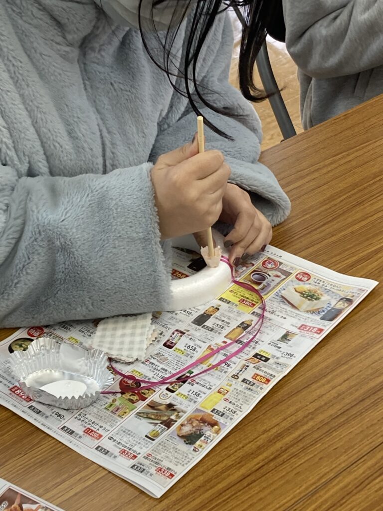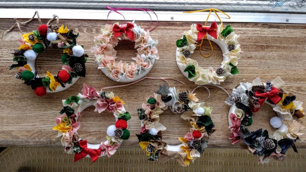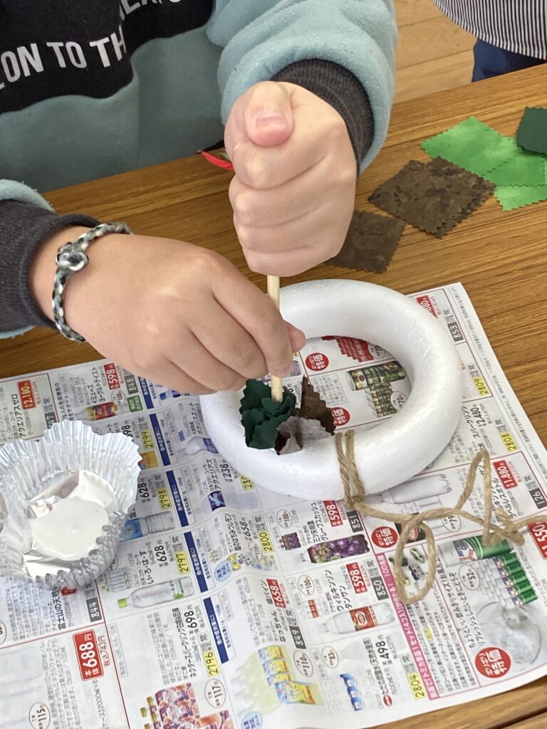 12月9日:みんなでクリスマスリースを作りました。思い思いの色を組み合わせて素敵なリースが出来上がりました。